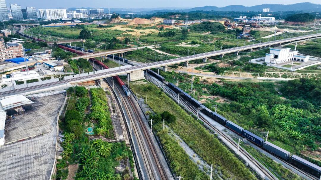 两列火车行驶在南宁国际铁路港。新华社记者 张爱林 摄