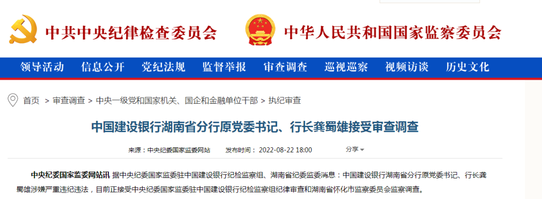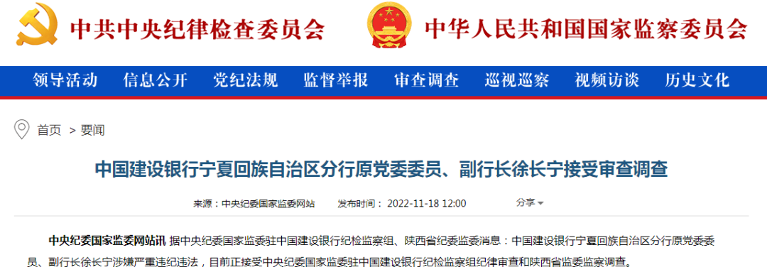 11月18日,中纪委网站发布消息,中国建设银行宁夏回族自治区分行原党委委员、副行长徐长宁涉嫌严重违纪违法,目前正接受中央纪委国家监委驻中国建设银行纪检监察组纪律审查和陕西省监委监察调查。