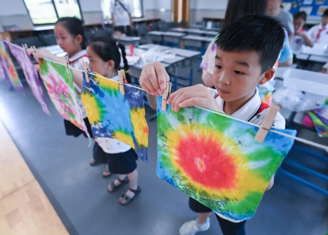 2022年8月10日,湖州市吴兴实验小学的学生把做好的扎染作品挂在教室里。新华社记者 徐昱 摄