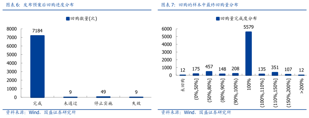 “真假回购”之辨:总体来说,A股市场股票回购真实确定性较高。2011年至今,市场上共发起7251次回购预案,其中99%以上最终得以完成,而未通过或失效等无效回购占比极少。另一方面,从已经完成的回购来看,大部分回购预案都属“真回购”。