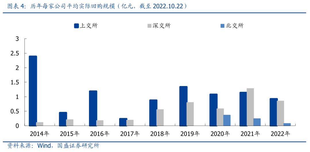 从平均回购力度来看,上交所公司每家的平均回购规模更大,近5年公司每家平均回购规模可达1亿元以上。而深交所公司平均回购规模相对较少,近5年每家平均回购规模0.8亿元。随着制度的持续优化,市场实施回购的公司家数和金额呈现稳定增长态势。