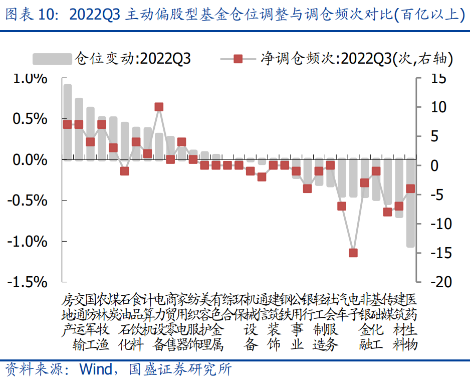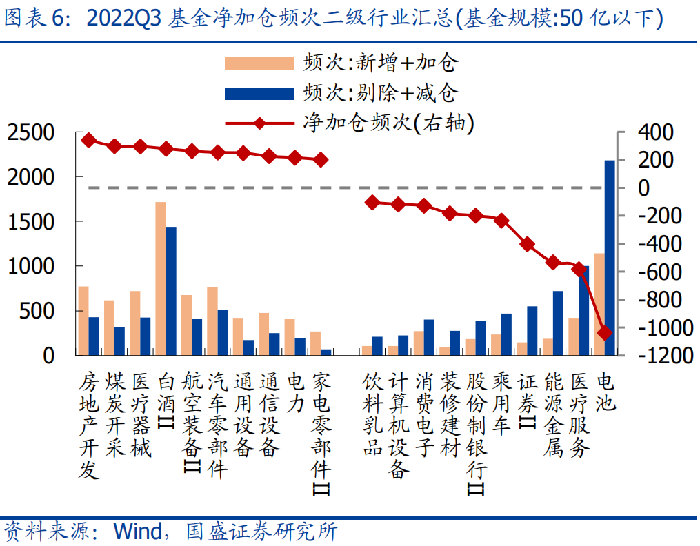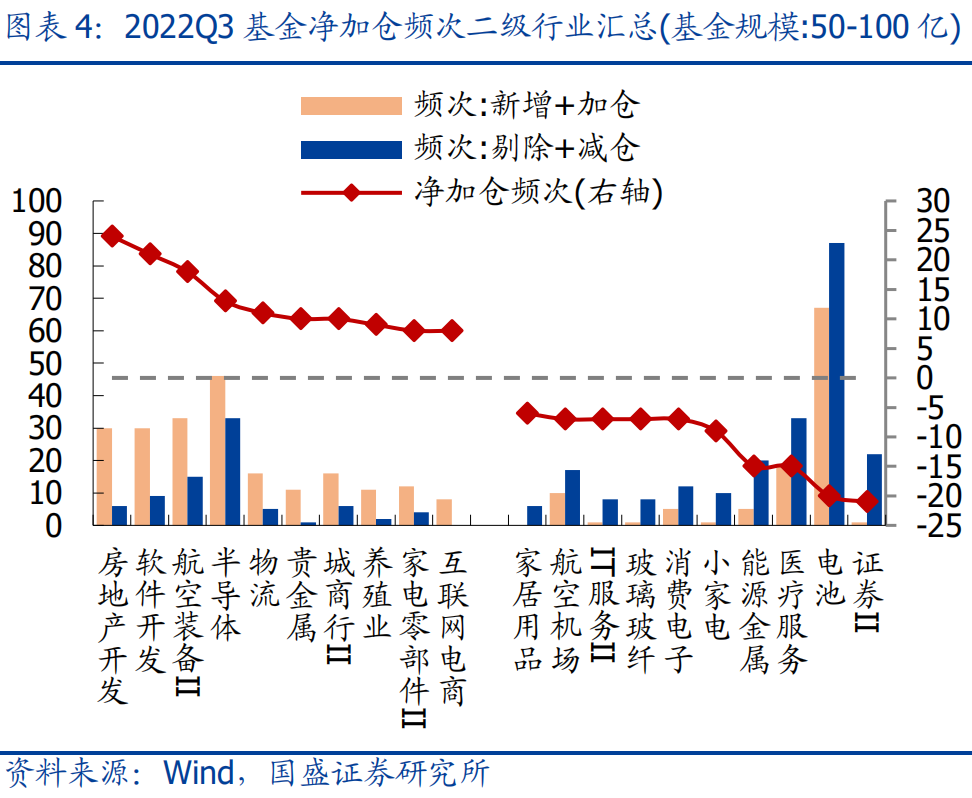 从微观视角出发,我们将主动偏股型基金按2022年三季度末的基金规模划分为三组:1)基金规模达到100亿元以上、2)基金规模介于50-100亿之间、3)基金规模不足50亿元。主要观测指标涵盖行业和个股两个维度,其中行业层面重点关注行业标的在三季度获基金合计净加仓频次,个股层面主要关注获基金净加仓/净减仓意愿较强的标的名单。