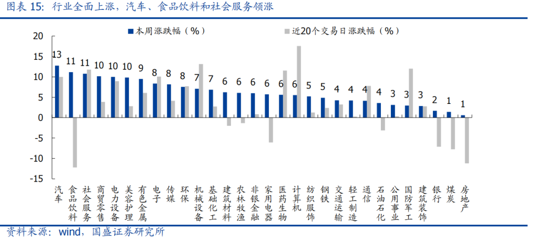 过去的一周,是中国资产的盛宴。沪指在周初下破2900点后,A股迎来了绝地反弹,港股、中概与之携手大涨。一方面是疫情形势出现积极变化,对市场产生较强催化,另一方面,官媒刊文强调实施扩大内需战略也进一步强化做多信心。此前持续超跌的消费核心资产(汽车、食品饮料、消费者服务)应声反弹,创业板单周涨近9%创下今年以来最大周涨幅、香港恒生指数创2011年10月底以来最大周涨幅,而恒生科技指数更是创有记录以来最大单周涨幅。
