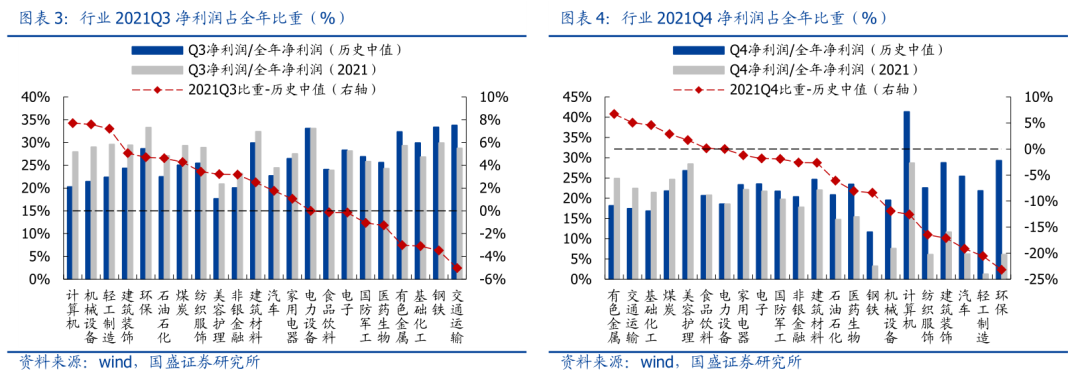 预计A股盈利22H2整体呈弱修复态势,22Q4修复强于22Q3。三季度以来,出口边际弱化、地产仍旧疲软等负面因素对经济造成拖累,需求的弱势可能导致A股盈利修复缺乏弹性。低基数效应驱动之下,22Q4盈利修复应强于22Q3,回顾上年,A股21Q3净利润仍然保持平稳,21Q4净利润则显著低于正常水平,可能原因在于亏损项目结算或资产减值计提情况体现在21Q4的净利润中。