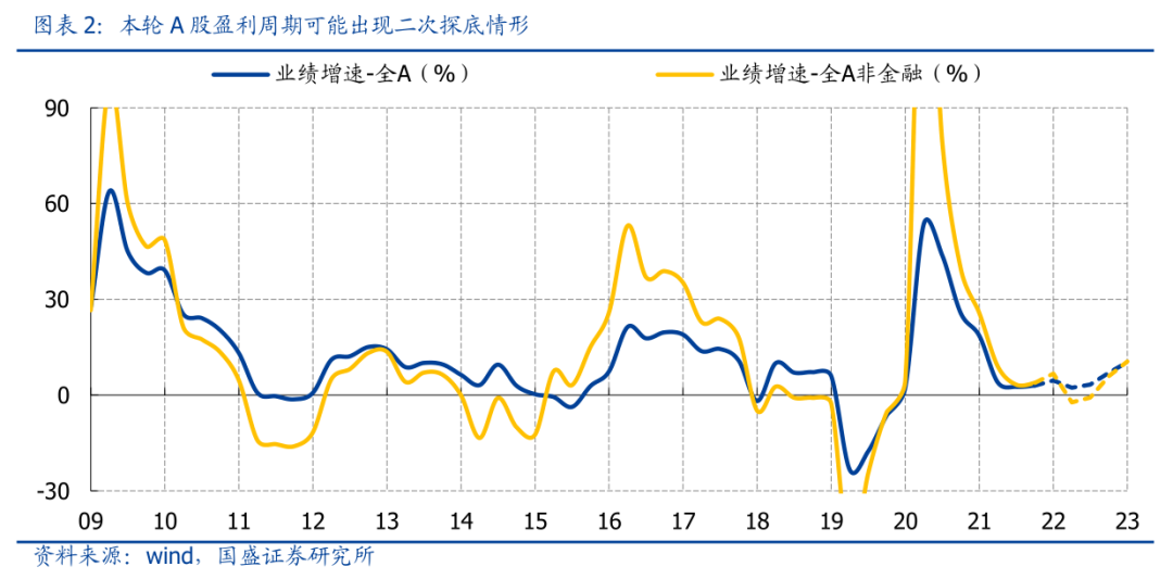 A股盈利周期可能于23Q1二次探底。回顾2006年以来A股数轮盈利周期,每次下行区间的持续时间约为2年,本轮盈利周期在21Q1见顶,对应正常情形下于22H2~23H1而非22Q2见底,而22Q2业绩韧性较强、并非绝对低点,因此A股盈利周期后续可能出现二次探底情形,考虑21Q4与22Q2低基数,A股二次探底时点大概率为23Q1。