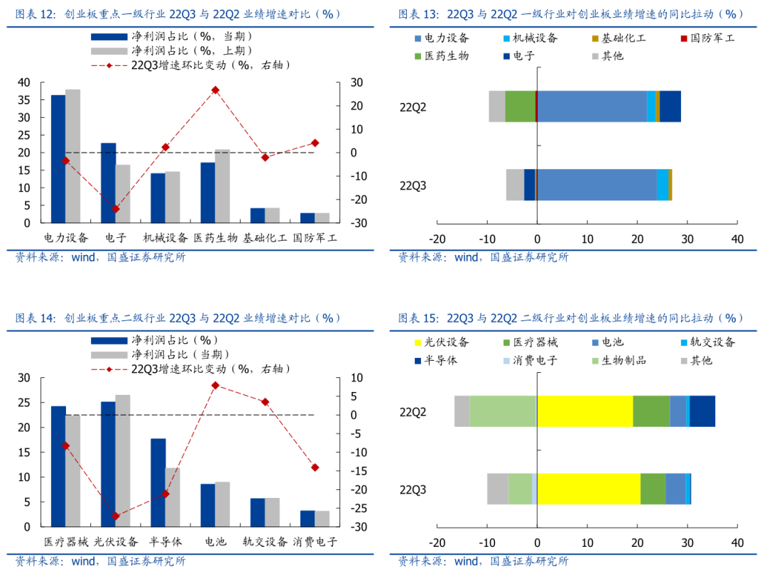 22Q3创业板业绩增速环比改善,电力设备的拉动作用继续增强。观察各行业对创业板增速的拉动作用来看,电力设备行业22Q3与22Q2的同比拉动分别为9.10%和6.61%,拉动作用明显增强。二级行业来看,电池拉动作用增强、医疗器械拖累收窄,前者相应同比拉动分别为8.19%和5.81%,后者相应同比拉动分别为-3.37%、-5.04%。此外,净利润占比较低的其他行业对板块的拖累减弱,也是创业板业绩增速改善的重要原因。
