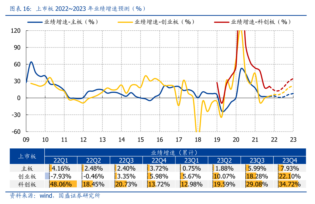 预计2023年主板/创业板/科创板全年业绩增速分别为7.93%/22.10%/34.72%。主板2023年业绩走势大概率与全A保持同步。双创方面,医药行业政策落地后盈利有望修复,半导体景气周期或迎触底回升,带动创业板、科创板全年增速回升。