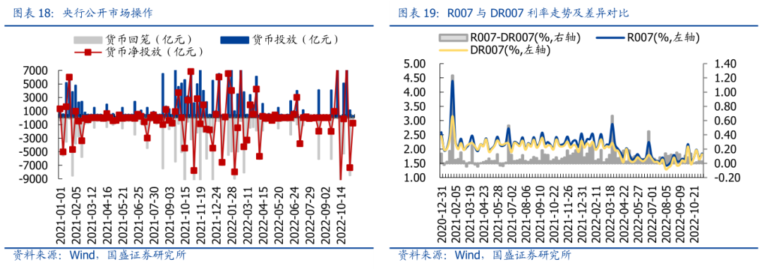 2022年11月11日当周,R007与DR007分别环比变动0.169%、0.185%,R007与DR007利差有所回落。截至2022年11月11日,R007、DR007与两者利差分别达到1.849%、1.822%和0.027%。