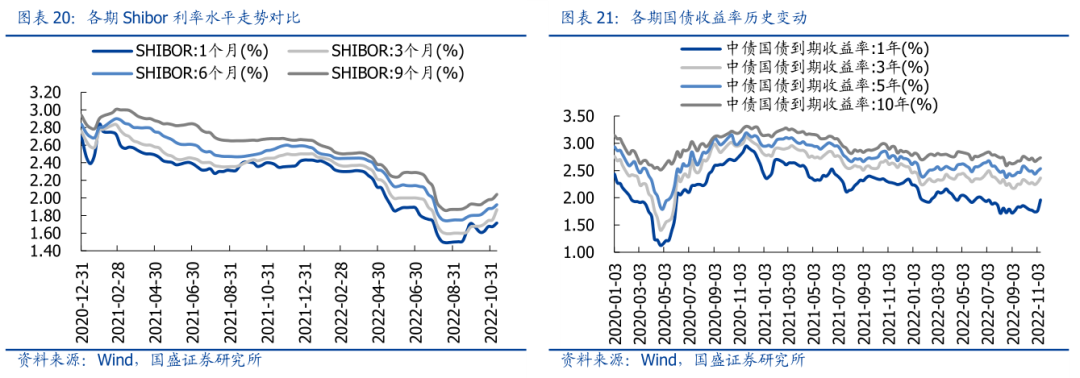 2022年11月11日当周,各期Shibor整体有所回升,其中1个月、3个月、6个月和1年期Shibor分别环比变动0.041%、0.114%、0.040%和0.052%。同时各期国债收益率整体有所回升,其中1年期、3年期、5年期和10年期国债利率分别环比变动0.199%、0.079%、0.046%和0.033%。