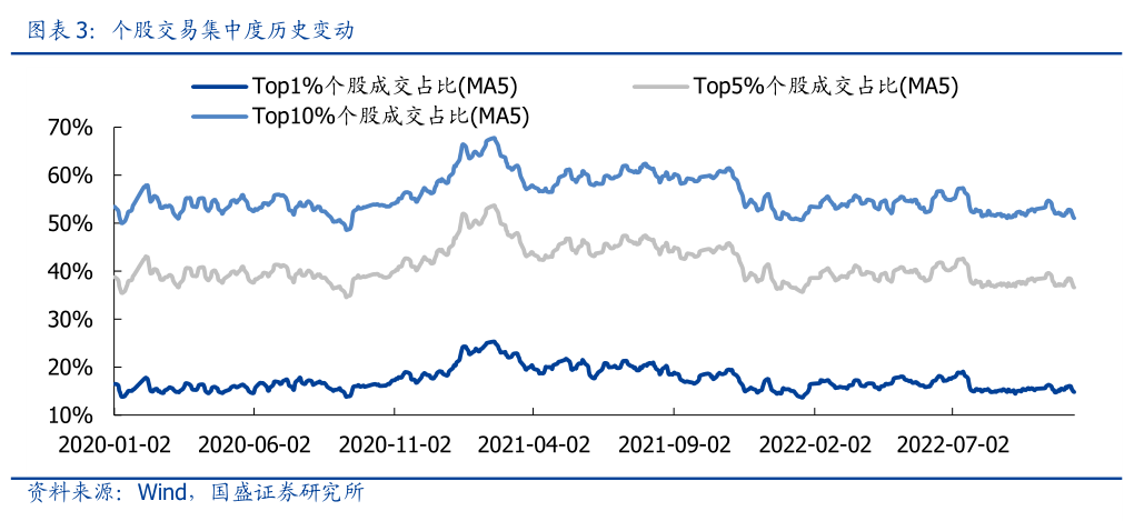 指标定义:交易集中度,反映成交额居前的个股及行业成交额累计占比。当交易集中度指标处于历史高位,市场将面临较高的资金拥挤度。