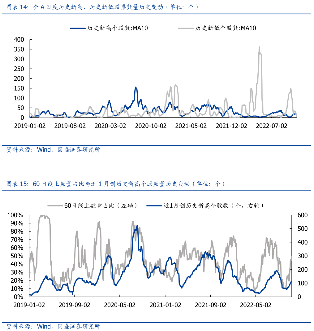 4)全A新高个股数目环比回升、新低个股数目环比回落。其中60日新高个股数量10日均线回升至192,60日新低个股数量10日均线回落至87;同时历史新高个股数量10日均线回升至17,历史新低个股数量10日均线回落至4。