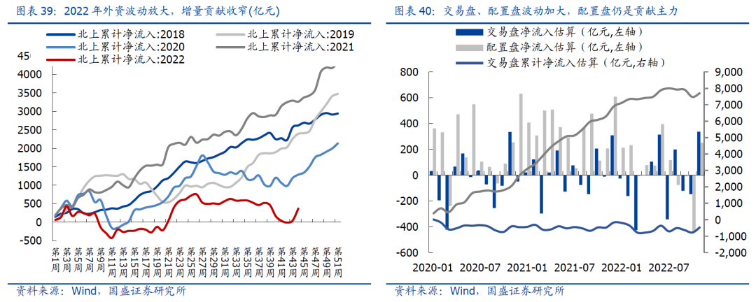 全年外资波动加大,累计贡献不足400亿,但全球流动性拐点将至,外资回流已经开启。今年以来,外“胀”与内“滞”反复制约外资风险偏好,全球流动性趋紧也反复制约外资入场节奏,除交易盘延续高波动外,配置盘也在年中罕见外流,波动加大与资金贡献趋弱是今年外资的主要特征。全年视角下,外资累计贡献约366亿增量资金,其中配置盘仍是入场主力,资金贡献约750亿元,而交易盘延续高波动且贡献继续收负。