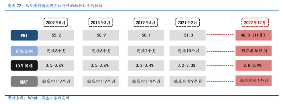 从贝塔行情向阿尔法行情的转折时点来看,大致满足这么几个特征:1)PMI>50,且经济连续扩张半年以上(2019年为2个月);2)10年期国债收益率与指数齐涨,并升至3.3%或以上;3)业绩周期触底,盈利预期(MAF)回升半年以上(2019年为4个月)。以目前(2022年12月)的情况看,未来1-2个季度可能都达不到转向的条件。