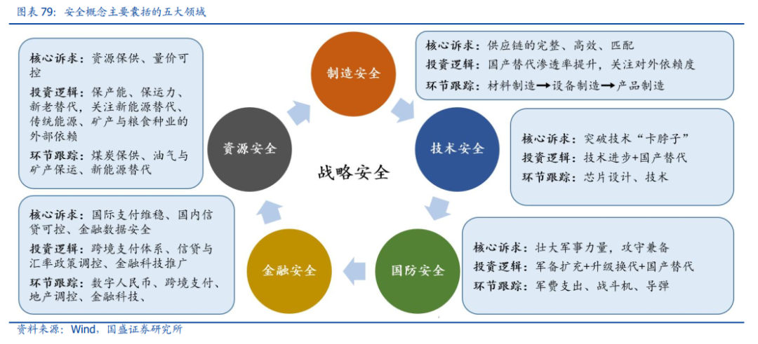 立足国家战略视角,安全概念主要囊括五大领域:资源、制造、技术、国防、金融。