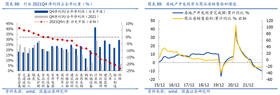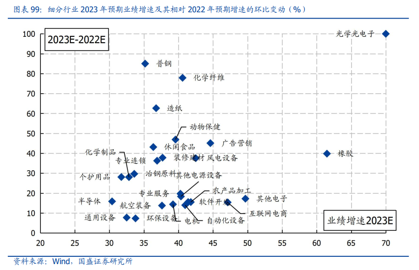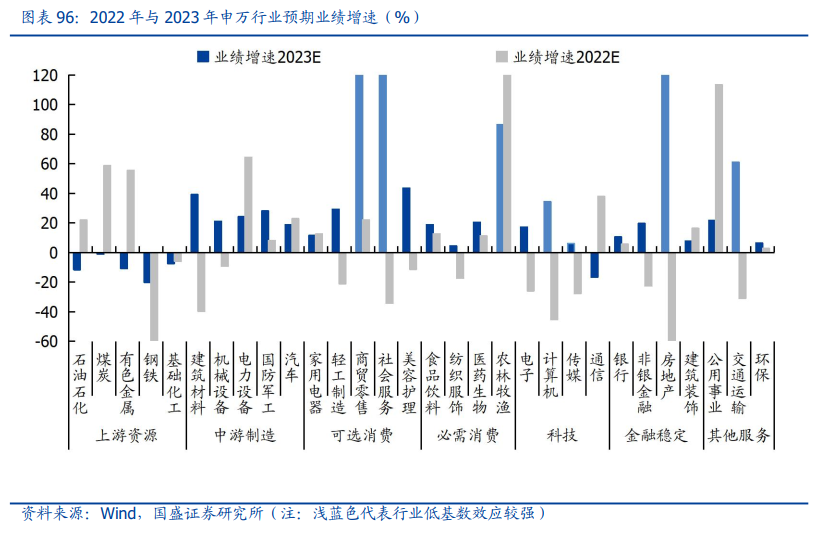我们基于分析师盈利预测对各行业2022年与2023年业绩增速进行估算,具体而言,首先从个股维度汇总wind一致预期净利润,然后根据分析师预测的高估情况进行下修,并考虑亏损项目结算等情况进行调整,从而求得各行业的预期业绩增速。