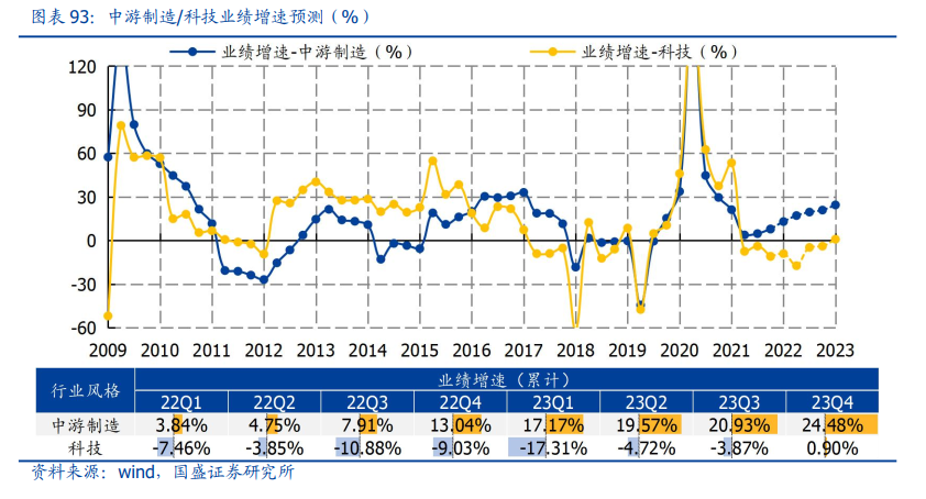中游制造延续正增,预计2022Q4/2023Q1/2023Q4业绩增速分别为13.04%/17.17%/24.48%。2022年四季度,先进制造业保持业绩高增;2023年,新能源增速放缓,但仍有望保持较高增长,同时房地产企稳带动建材、工程机械等传统制造业盈利修复。