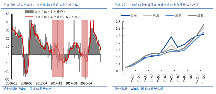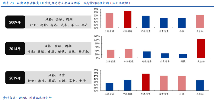 以出口拉动转负+内需发力的时点看后市的第一波行情,特征可以归纳如下:1)受益于宏观政策的全面发力以及流动性的宽松,在出口转负、内需发力的组合下,A股各宽基指数整体涨幅明显;2)市场风格整体偏向大盘蓝筹,以金融、周期、消费为代表的内需依赖型行业普遍获得超额收益,而海外营收占比高、外需产业链分布较广的科技成长型行业表现相对较弱;3)宏观政策的刺激力度和方向决定了内需板块的相对强弱,在2009年、2014年基建地产政策全面发力的背景下,以金融、周期为代表的传统政策导向型行业更具优势,而2019年政策相对克制、经济内生增长动力仍强的环境下,则是后周期的消费行业领涨市场。