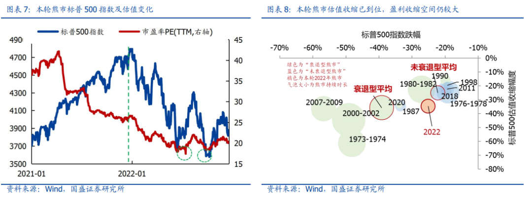 结论3:美股杀估值进程基本到位,但盈利端压力仍未释放充分,2023年美股预计先抑后扬。过去一段时间,美国经济指标与美股走势严格反向,市场仍在博弈“宽松-估值”,而较少定价美股盈利压力。对标历史历次美股熊市(衰退型与非衰退型),本轮标普500估值收缩幅度已达到衰退型熊市平均水平。随着经济衰退的不断加深,美股盈利端仍有20+%的下行压力,基于温和衰退(软着陆)的中性假设,美股在2023年走势预计先抑后扬,在下半年重拾升势。
