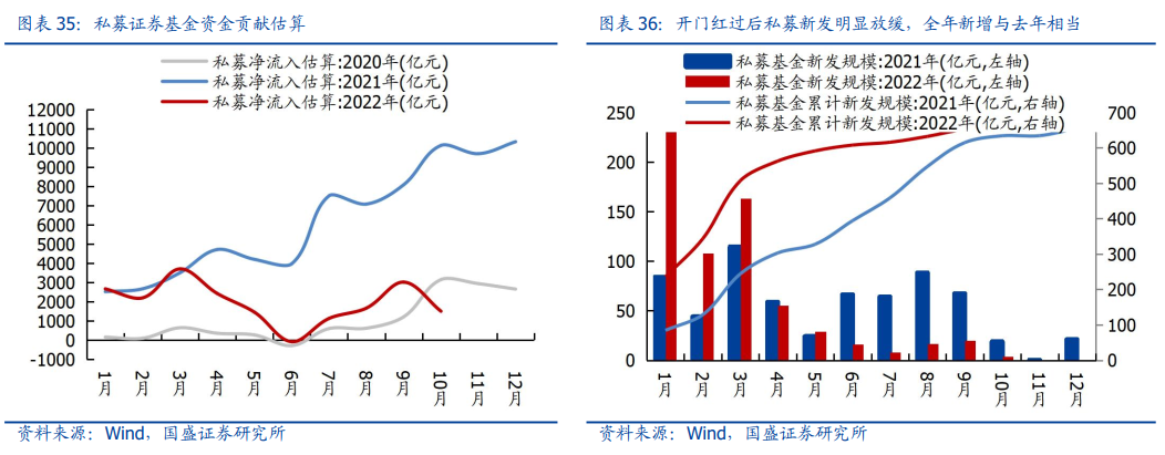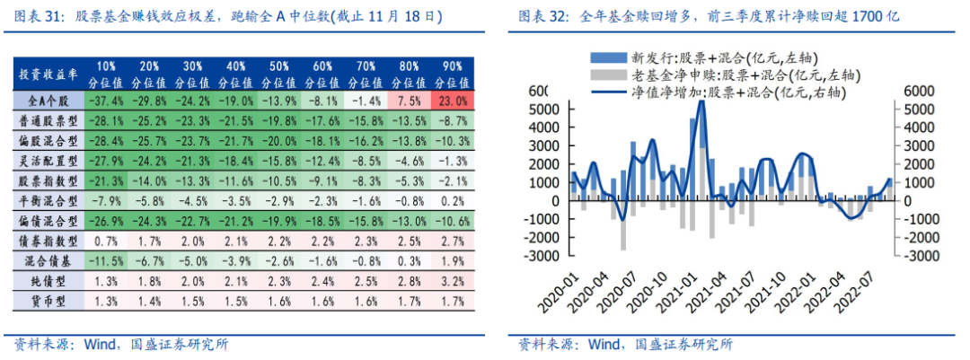全年视角下,公募基金资金贡献明显缩量,前三季度资金增量不足2000亿,略高于2019年水平。公募基金赚钱效应转弱,偏股基金普遍跑输大盘。今年以来,市场波动加大且结构主线轮动加快,基金收益率普遍回调,普通股票型、偏股混合型与灵活配置型收益率中位数分别约-19.8%、-20.0%、-15.8%,均跑输全A个股涨跌幅中枢-13.9%。新发低位徘徊,赎回拖累明显:除1月新发“开门红”外,全年基金发行低位徘徊,月均新发仅约300亿(股票+混合);同时,二季度市场深V反弹,基金赎回明显增多,2-8月累计赎回近4000亿。