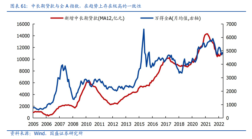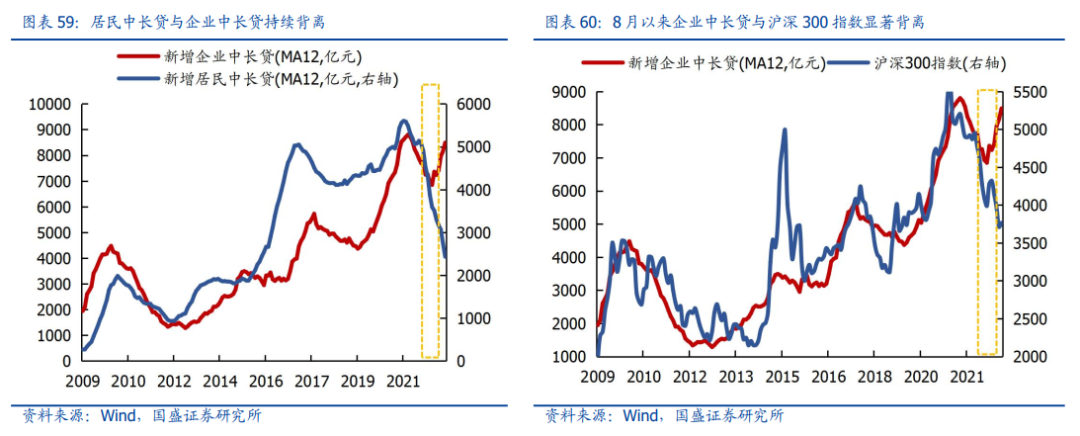 从2022年的结果看,离开居民杠杆的宽信用,市场并不认可——这就是A股的事实。历史经验来看,企业中长期贷款与大盘呈现出较高的正相关性;然而2022年A股大盘与企业中长贷之间却出现了明显的背离:即便信贷总量与结构(中长贷)均已经企稳向上,但沪深300为代表的权重指数却持续回落。最关键的一点,是本轮信贷结构与以往周期最大的不同,就是居民与企业的“脱钩”,即居民中长贷并未跟随企业中长贷回升。