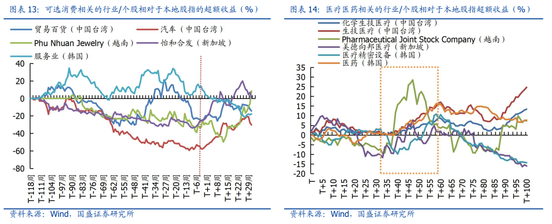 结论3:相较于经济的波动,疫情政策放开后,股市表现相对更淡定;而行业表现则取决于前期疫情期间的涨跌。参照亚洲地区经验,在防疫优化政策落地后,权益市场整体保持了稳中向好的局面,并且各地区核心股指相对MSCI全球指数的超额收益在政策落地后的20日左右达到最大值;消费行业基本面的修复并不一定带来股价的上涨,这取决于股价在此前是否由于疫情而下跌——前期的股价受疫情影响程度较大时,疫情优化政策的落地才会对股价形成明显的正向利好;防疫优化落地后的一个月后,医疗板块通常会迎来一波月度级别的上涨行情。