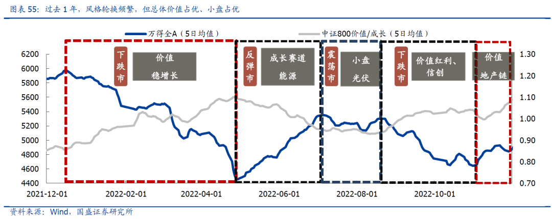 2022年,是个典型的熊市行情,全年价值占优、小盘占优。过去1年,想战胜市场,要做对两件事,要么频繁做波段:年初押稳增长、二季度抄赛道、三季度切小盘、四季度进地产;要么全程拿价值:煤炭、地产、黄金、低估值。