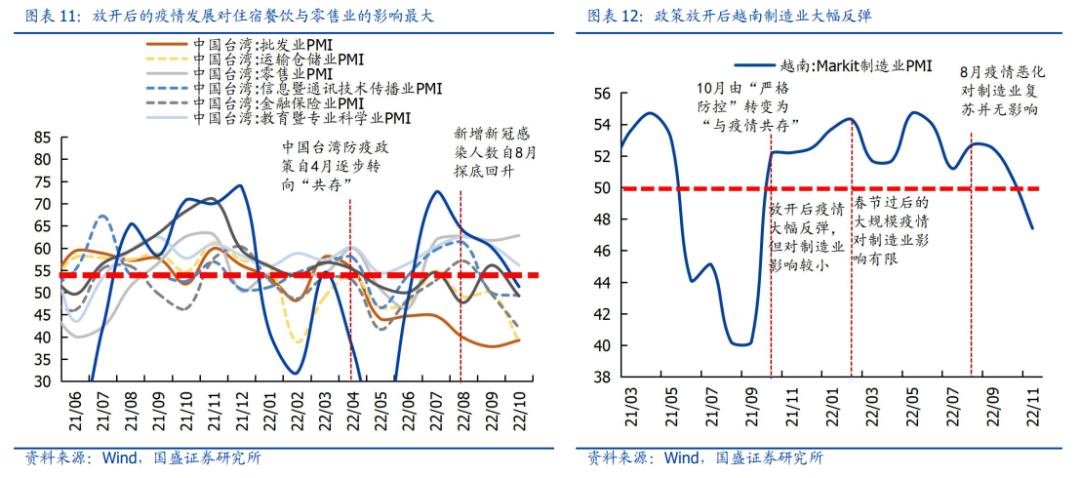 结论2:行业层面看,服务业稳步向上、住宿餐饮弹性相对较高,制造业复苏力度则取决于前期受损情况。服务业在防疫政策放开2个月后稳步修复,其中住宿餐饮景气回升的幅度较高,零售业同样表现亮眼;制造业角度看,相较于中国台湾与新加坡,越南体现出更强的复苏弹性,可能的原因是越南的制造业在经济中的比重相对更高、前期受疫情影响更大。