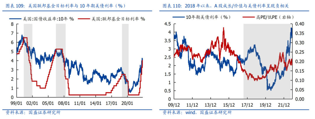 今年12月到明年,有望看到美联储加息逐渐放缓直至停止,叠加海外经济衰退压力,美债利率大概率出现下行趋势。2018年以来,10年期美债利率与国内的成长/价值风格出现明显的负向关联,则未来美债利率下行有望驱动成长风格走强。