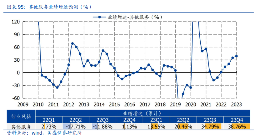 其他服务持续改善,预计2022Q4/2023Q1/2023Q4业绩增速分别为1.13%/13.55%/38.76%。公用事业方面,煤炭价格对火电盈利的压制逐渐缓解,拉动板块业绩逐渐修复,其中又以2022Q4受到的提振较强;交通运输方面,油运景气有望保持强势,同时随着疫情扰动逐渐钝化,航空机场经营情况也逐渐好转。