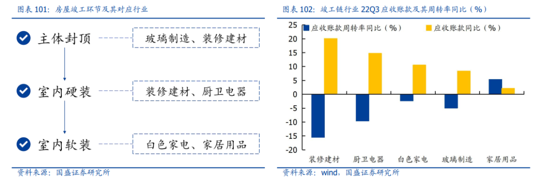 本轮房地产宽松政策侧重于竣工端、以“保交楼”作为重点推进方向,“销售→新开工→竣工”的传统路径大概率难以重现,竣工链行业在本轮周期中受益程度相对较大。而考虑房企信用风险向上游产业的扩散,我们基于各竣工链行业应收账款及其周转率恶化程度进行排序,装修建材、厨卫电器以及白色家电应收账款情况恶化较严重,在竣工端修复后有望展现出更强弹性。