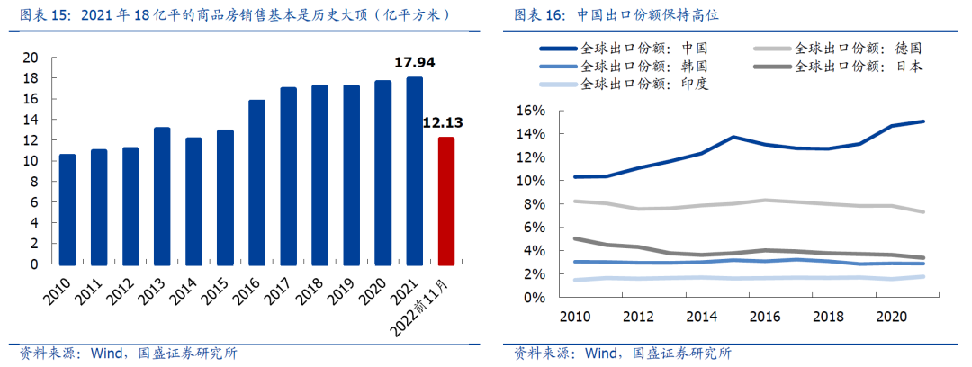 长期来看,去地产化与新旧动能转换是大势所向,优势制造的未来是星辰大海。2022年H1,地产+建筑业对我国GDP形成负拖累,这是过去30年来的第一次。从长周期的视角看,2021年18万亿平的商品房销售基本是历史大顶,它标志着一个黄金时代的终结。未来,经济的去地产化与新旧动能转换,是大势所向,在能源成本与供应链优势之下,中国出口占全球份额稳中趋升。海外的滞胀,是中国的繁荣,优势制造的未来是星辰大海。