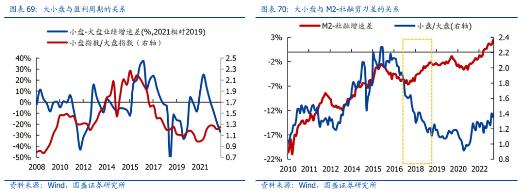风格排序:1、大盘蓝筹>中小市值,2、内需博弈>外需依赖,3、来年增长>即期业绩。首先,盈利周期筑底(非上行),小盘股业绩弹性不占优势;其次,央行克制下的宽信用,M2-社融剪刀差大概率见顶;最后,现阶段增量资金多来自于场内绝对收益,主要布局方向也是大盘股。到下半年,随着业绩和海外冲击的减弱,小盘成长具有阶段性的配置机会:一方面,下半年盈利周期有望确立上行趋势,小盘股业绩弹性占优;另一方面,下半年海外衰退对国内基本面的冲击或将减弱(小盘成长风格的海外营收占比更高),而联储转向宽松也更有利于长久期的小盘成长型风格。
