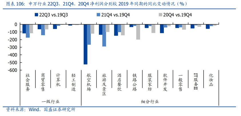 分别统计各行业22Q3/21Q4/20Q4净利润较2019年同期的同比变动情况,社会服务、商贸零售、计算机以及轻工制造行业近三年盈利均未恢复至疫情前水平,后续随着防疫政策优化有望加速修复,细分行业则包括航空机场、旅游及景区、酒店餐饮、铁路公路、服装家纺、软件开发、一般零售、IT服务、化妆品等。
