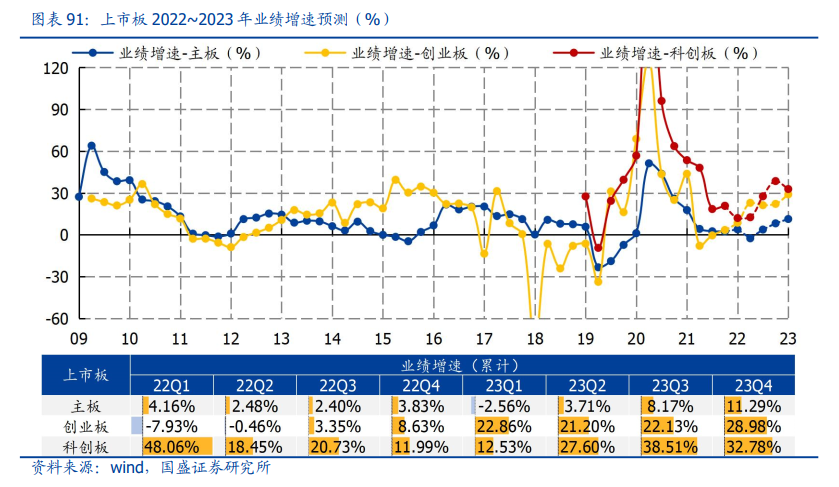 预计主板/创业板/科创板2022年业绩增速分别为3.83%/8.63%/11.99%,2023年分别为11.29%/28.98%/32.78%。主板2023年业绩走势大概率与全A保持同步。双创方面,2023年一季度,创业板面临新能源低基数,而科创板面临新能源与医药高基数;2023年全年,医药行业盈利有望修复,半导体景气周期或迎触底回升,带动创业板、科创板全年增速回升。