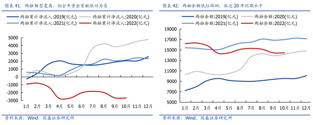 两融规模震荡下挫,资金贡献持续收负。今年以来,市场波动加大,两融资金也成为波动放大的重要推手,3、4月份及9月份相继大幅流出,全年资金贡献也依旧收负,前10个月累计流出约2692亿元。与此同时,两融余额也明显缩量,重回1.4万亿关口,临近2020年同期水平,展望明年,两融资金的活跃度仍有赖于市场情绪的修复与提振,明年的内外部环境有望迎来些许改善,两融资金预计也将扭负为正,预计两融全年贡献千亿级别的增量资金。