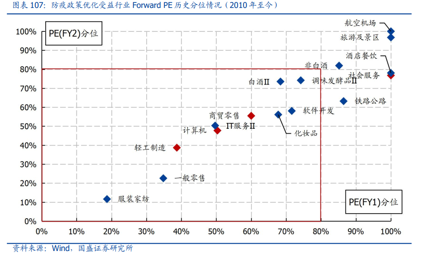 值得注意的是,部分防疫政策优化受益行业当前的估值并不便宜,从Forward PE来看,一级行业中的社会服务,以及细分行业中的航空机场、旅游景区、非白酒、酒店餐饮、铁路公路处于绝对的高估状态,应予以规避。