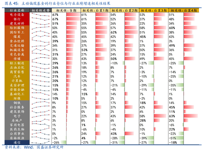 我们选取2010年以来,主动偏股基金的行业仓位与行业业绩增速(剔除奇异值)作为观测样本,从历史经验来看,多数行业仓位调整与自身业绩增速变动存在正向关联;且多数与当期业绩增速挂钩最为显著,其中电力设备、银行、建材、纺服相关性居前,均达到50%及以上。