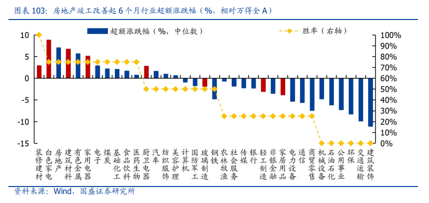此外,我们对2010年至今四次竣工改善时点进行回顾,统计竣工改善起6个月行业超额涨跌幅情况,优势行业同样指向建筑材料(装修建材)以及家用电器(白色家电、厨卫电器)。