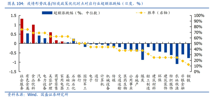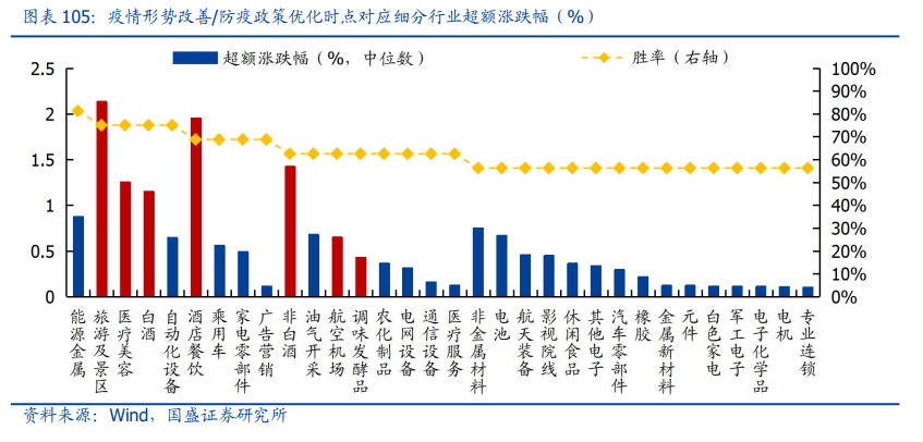 统计年内历次疫情形势改善/防疫政策优化时点对应的行业表现,取得超额涨幅且胜率较高的行业包括社会服务、食品饮料、美容护理、商贸零售以及家用电器,细分行业包括旅游及景区、医疗美容、白酒、酒店餐饮、非白酒、航空机场、调味发酵品。