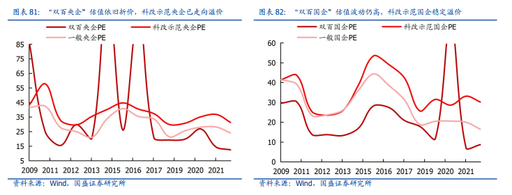 “双百行动”与“科改示范行动”推动国企改革“修炼内功”,“双百”国央企依旧普遍处于折价状态,科改示范国央企普遍实现了国央企内部的估值溢价。