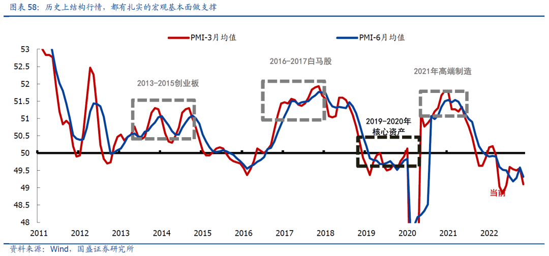 纵观A股历史,所谓的结构牛,从来都离不开扎实的宏观基本面。过去10年,中国经济下台阶与转型过程中,出现过很多“转型牛”、“结构牛”;但这些行情背后,都是有稳健的宏观基本面做支撑,例如:2013-2015年创业板、2016-2017年白马股、2021年高端制造,都发生在PMI持续扩张区间;2019-2020年的核心资产,则是不差的经济叠加了宽松的美元周期;而当前的经济环境,在各个维度上均与上述情形相差甚远。