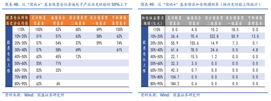 加仓弹药潜力来看,结合三季度末的基金规模,对泛“固收+”基金的权益增配规模可以加以测算,则加仓潜力主要集中在灵活配置型基金(20%-90%权益仓位)、偏债混合型基金(10%-40%权益仓位)和二级债基(10%-20%权益仓位),合计潜在弹药规模预计在1000-1500亿。