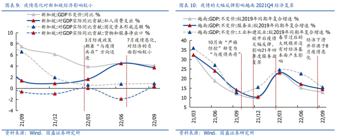 结论1:经济活动短期内是否二次下台阶,取决于防控放松后的疫情反弹幅度;但从更长视角看,管控放开比较确定地利好经济恢复,后续疫情扰动逐渐弱化。若后续疫情发展的趋势、峰值低于放开前的状况(如新加坡),则经济活动在当季就会迎来快速回升;若疫情迅速反弹、峰值显著高于放开前,则经济活动会面临一定的冲击(1-2个月),如中国台湾和越南;但从更长视角看,管控放开比较确定地利好经济恢复(次季度),即便后续疫情再度反复,冲击也会逐渐弱化。