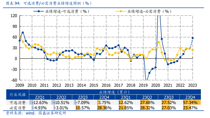 可选消费显著回暖,预计2022Q4/2023Q1/2023Q4业绩增速分别为3.75%/12.62%/57.34%。2022年四季度,家电盈利保持韧性是板块整体业绩的重要支撑;2023年,地产竣工端改善驱动家居修复,同时社服零售减亏,板块盈利释放较大弹性。