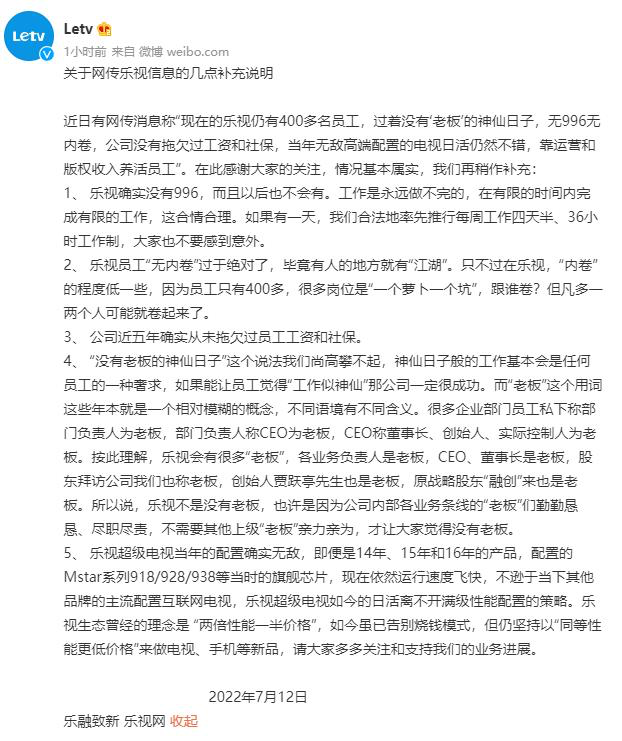 乐视官方后来确认情况基本属实,但“没有老板的神仙日子这一说法高攀不起”。