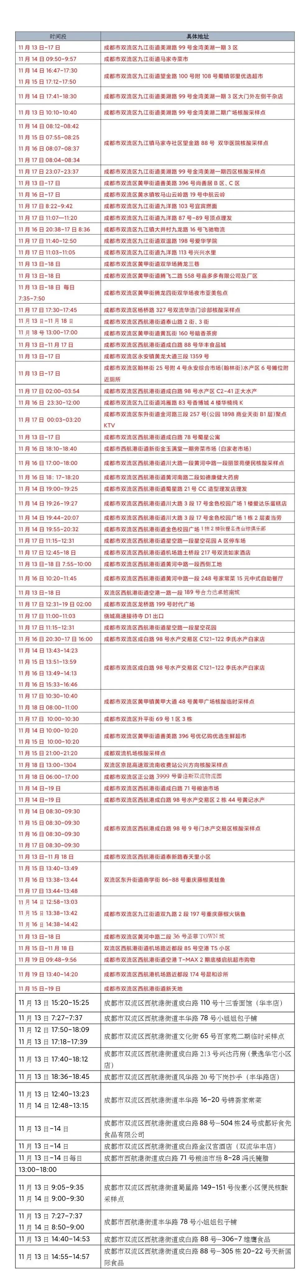 为方便市民排查风险轨迹,现将近期新增感染者在双活动轨迹整理如下,请市民朋友们对照自查,如与以下时间和空间有重叠,立即主动向社区和单位(或居住的酒店)报备,三天内接受三次核酸检测(间隔24小时),期间做好个人防护,不聚会、不聚餐。如有疑问,请拨打12345咨询。