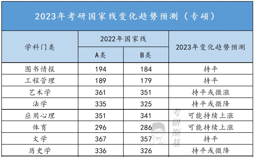根据上述所分析的原因、专业的热门程度、试题难度,以及考生发挥和阅卷因素等,预测2023年考研国家线变化趋势如下表所示。下面对几个热门专业进行一个说明。