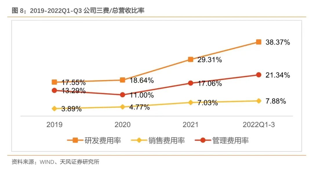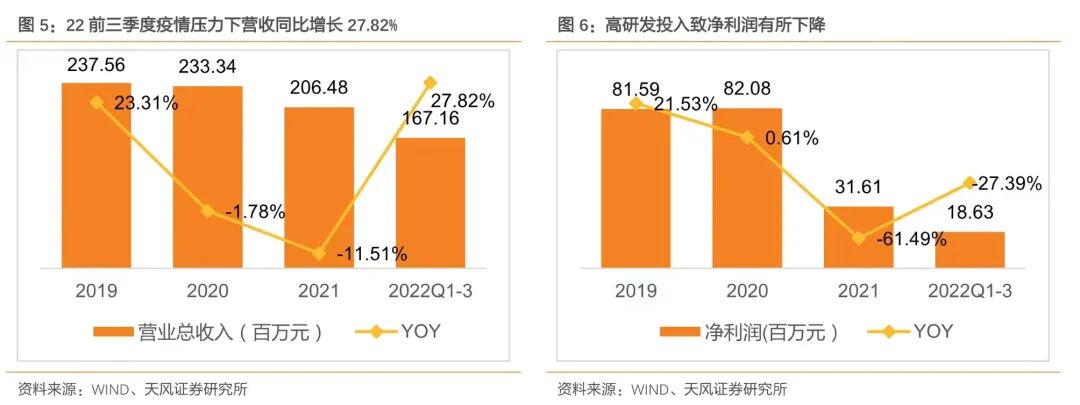 海外疫情影响下公司2020-2021年业绩承压,2022年疫情影响减弱,营收有望进入快速增长阶段。公司2019-2021年总营收分别为2.38、2.33、2.06亿元,2019-2021年净利润分别为0.82、0.82、0.32亿元。2020-2021年公司收入略有下滑,其主要原因在境外新冠肺炎疫情出现重大反复的大背景下,公司境外业务遭受一定冲击。与此同时,行业竞争态势进一步加剧,带来了一定的价格竞争压力。并且公司各项投入尤其是研发投入逆势提升,由此导致公司利润明显承压。2022年前三季度,在国内疫情压力下,公司营收较去年仍实现同期增长27.82%。此外,公司持续加大研发投入,研发费用共计6414万元,占当期营业收入的比例达到38.37%,研发投入较21年同期同比增长64.26%,研发投入和研发投入占收入比例均创公司历史新高。