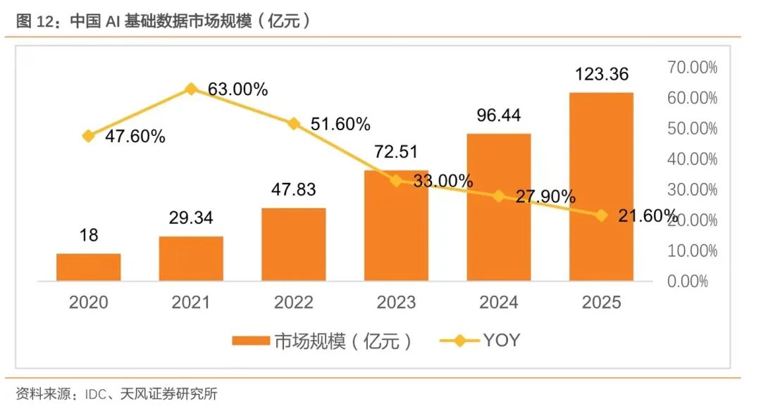 模型训练需大量数据支撑。根据Dimensional Research的全球调研报告,72%的受访者认为至少使用超过10万条训练数据进行模型训练,才能保证模型有效性和可靠性,96%的受访者在训练模型的过程中遇到训练数据质量不佳、数量不足、数据标注人员不足等难题。为应对训练数据所带来的多方面挑战,AI企业开始从第三方购买原料数据收集、训练数据生产和数据专家咨询等服务,调研结果指出,外包服务能够有效加快算法模型落地应用的速度。2025年中国AI基础数据市场规模或将超120亿。《2020年中国AI数据服务行业研究报告》分析认为,在人工智能下的各场景需求剧增的情况下,作为AI技术的底层支撑,数据服务尤为重要。伴随技术的成熟、平台的布局,未来市场发展潜力将不断拓展,AI数据服务+各场景将成为可能。根据IDC发布的《2021年中国人工智能基础数据服务市场研究报告》,预计中国AI基础数据服务市场规模近5年来的复合年增长率达到47%,预期2025年将突破120亿元,达到中国人工智能市场支出总额的约10%。AI基础数据市场规模的高速增长一方面得益于数据对于AI应用的重要性提升,另一方面则得益算法模型持续更新带来的增量数据需求:1)“二八定律”凸显AI时代数据重要性。AI系统是由代码和数据组成,国际权威ML学者吴恩达认为如果没有高质量的数据集,AI系统就会失败。此外,其一直强调“以数据为中心的AI”,提出了著名的“二八定律”,即80%的数据+20%的模型=更好的机器学习,突显数据对于AI系统的重要性。2)根据麦肯锡报告,深度学习模型对训练数据的数据量、多样性和更新速度方面提出较高要求。为充分发挥技术潜能,深度学习模型需要海量且涵盖图像、视频及语音在内等多种类型的训练数据进行模型训练。此外,人工智能技术要求算法模型根据潜在的应用场景变化而持续更新,因此,算法模型所使用的训练数据亦需要定期更新。具体而言,约 1/3 的算法模型每月至少更新一次,约 1/4 的算法模型每日至少更新一次,算法模型持续更新的特点将进一步拓展各领域训练数据的需求空间。行业数据横向拓展将进一步扩充市场空间。除基础数据市场外,AI技术已在科技互联网、社交、IoT、智能驾驶等多个领域实现技术落地,AI+垂直场景相结合的趋势、以及这些垂直行业自身的蓬勃发展将有望释放海量的训练数据需求。我们认为,当AI+模式更加深入地扩展到工业、金融、医疗等更多领域时,或将呈现出更加宏大的增量商业价值和潜力。而这些因素,有望对AI数据领域带来更大的增量市场空间。