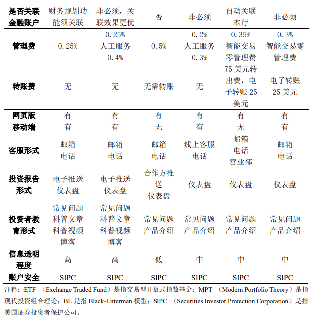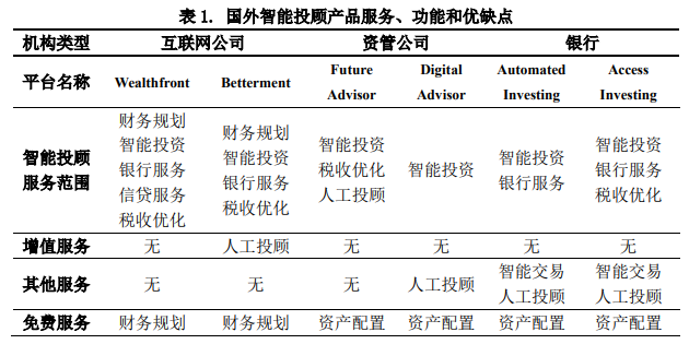 为了深度分析国外智能投顾的运营模式,本文分别选取两个互联网公司智能投顾平台(Wealthfront和Betterment)、两个资产管理公司智能投顾平台(贝莱德FutureAdvisor和先锋Digital Advisor)和两个银行智能投顾平台(摩根大通Automated Investing和摩根士丹利Access Investing),共六个案例展开研究。可以看出,不同的智能投顾平台具有各自的特点和优势。